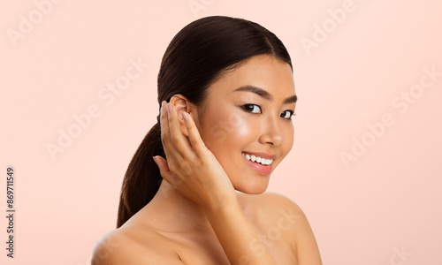 asian, chinese, korean, woman, lady, isolated, female, adult, young, beautiful, attractive, portrait, pink, background, hair, long, black, ponytail, face, chin, hand, touch, looking, side, smile, beauty, model, studio, skin, healthy, clean, clear, natural, fresh, soft, glowing, natural light, feminine, elegant, graceful, delicate, head shot, skincare, cosmetic, make-up, fashion, style