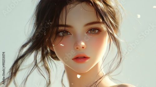 A young Asian woman with long, flowing hair gazes softly at the camera, surrounded by gentle light and ethereal elements.