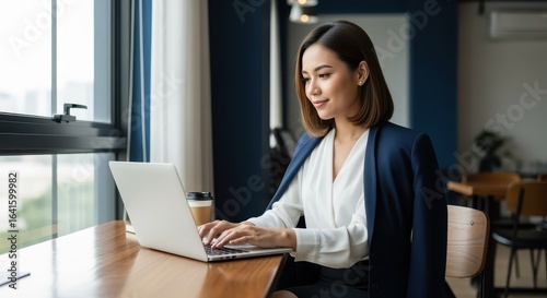 woman, asian, laptop, computer, working, business, professional, office, desk, table, window, light, bright, modern, interior, indoor, corporate, executive, employee, job, career, occupation, technology, communication, online, cyberspace, digital, device, screen, display, typing, keyboard, hand, blazer, jacket, blouse, shirt, clothing, attire, formal, smart, confident, focused, concentrated, serious, adult, young, female, person