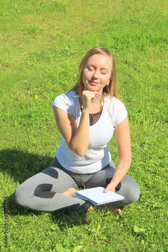 young, beautiful, girl, white, t-shirt, eye, closed, sit, green, grass, lawn, notebook, pen, hand, chin, thinks, dream, text, poem, woman, eye, relaxation, teenage, person, meadow, vacation, summer, dream, female, field, holiday, lady, meditation, smile, weekend, pretty, nature, day, park, imagination, joy, peaceful, relaxing, time, smiling, caucasian