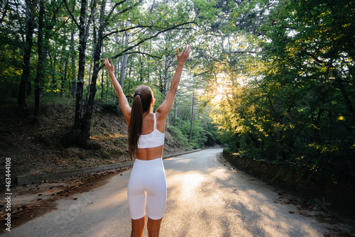 A young beautiful girl poses with her back raised up before running training, on the road in a dense forest, during sunset. A healthy lifestyle and running in the fresh air.