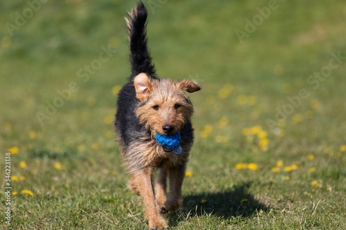 A young black and brown mixed breed dog walks with a small ball in his teeth and carries it to the owner.