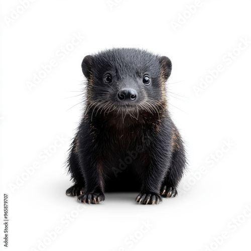 A young black mongoose sitting against a clean white background, showing a curious and innocent facial expression.
