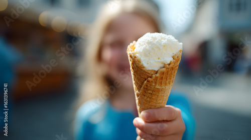 A young blonde girl holds out a delicious vanilla ice cream in a waffle cone, with her happy face blurred in the background. A sweet childhood moment enjoying a frozen dessert on a sunny summer day.