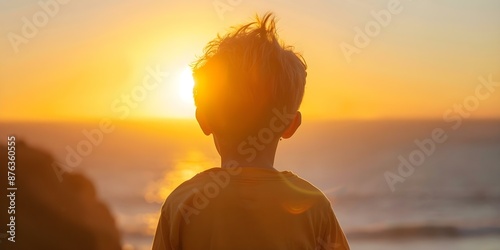 A young boy admires the sunset-lit ocean cliff. Concept Landscape Photography, Sunset Portrait, Ocean View, Nature Inspiration, Youthful Wonder