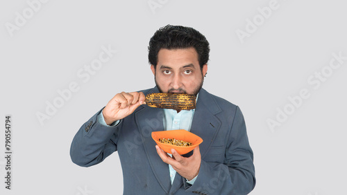 wellness, vitamin, grain, harvest, joy, ravenous, human, ripe, happiness, vegetarian, health, nourishment, vegetable, gold, corn, popcorn, isolated, maize, happy, raw, male, ingredient, cob, kernel, portrait, holding, white, young, husk, eat, healthy, lifestyle, blue, cheerful, sweet corn, meal, yellow, beauty, nature, background, natural, sweet, food, fresh, beautiful, diet, organic, closeup