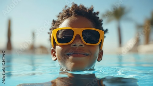 A young boy enjoys the water while wearing stylish sunglasses, capturing a moment of fun and relaxation under the sun.