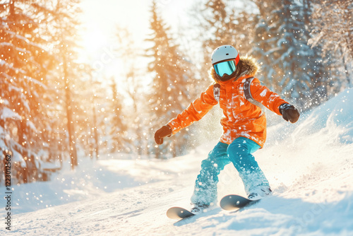 skiing, boy, snow, winter, sport, fun, children, happy, snowflake, mountain, adventure, active, youth, playful, nature, cold, leisure, goggles, helmet, snow-covered, landscape, sunlight, cheerful, excitement, thrill, winter sports, snowboarding, athlete, energetic, forest, winter landscape, bright, casual clothes, enjoyment, freedom, movement, action