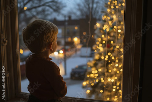 little, boy, looking, out, window, christmas, tree, young, lit, light, children, winter, snow, night, decoration, holiday, indoor, festive, celebration, standing, front, decorated, wearing, brown, sweater, back, camera, facing, open, view, outside, snowy, street, car, building, background, bright, colourful, creating, atmosphere, sky, dark, mood, peaceful, serene