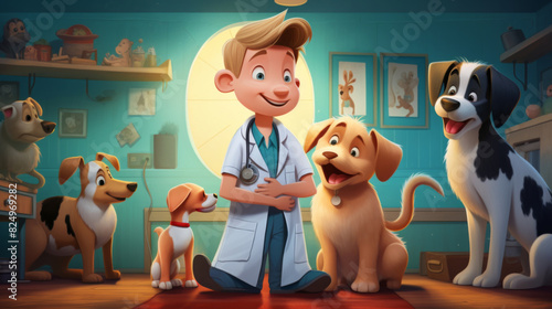 A young boy stands beside a group of dogs, possibly at a veterinarians office, engaging with the animals