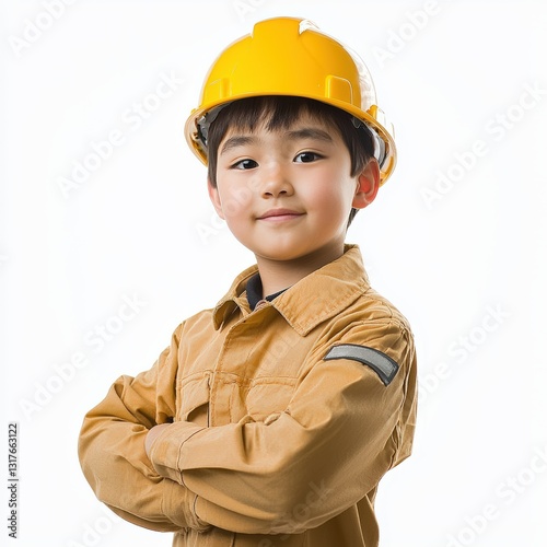 arm, boy, children, construction worker, cross, hat, helmet, overall, portrait, smile, racked, wear, yellow, construction, men at work, builder, engineer, children, people, work, architect, person, industry, hard hat, safety, contractor, woman, business, face, childhood, handyman, building, carpenter