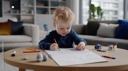 A young child deeply absorbed in coloring at a cozy table, illustrating creativity and focused imagination in a warm, inviting setting.
