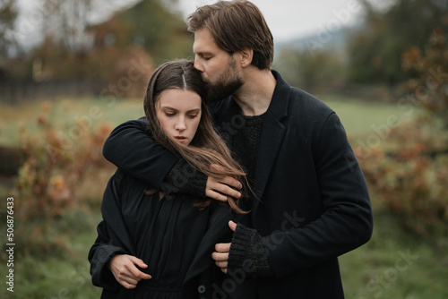 A young couple in love in black coats walks in the countryside in the rain. Autumn gloomy mood. cinematic image