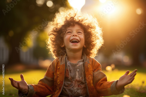 A young curly boy laughs and looks at the sky in the rays of the setting sun. End of warm days concept