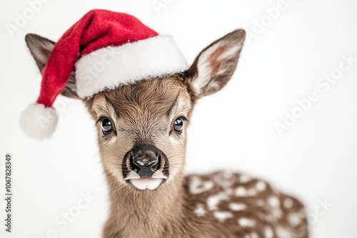 A young deer fawn, wearing a festive red Santa hat, stands against a pristine white backdrop, capturing the essence of Christmas magic and innocence.