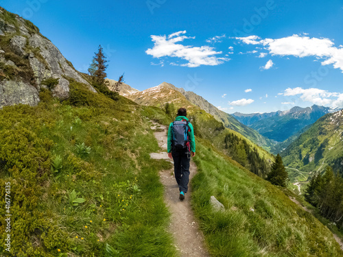 A young female hiker does trail hiking in the mountains of Gastein in Austria.