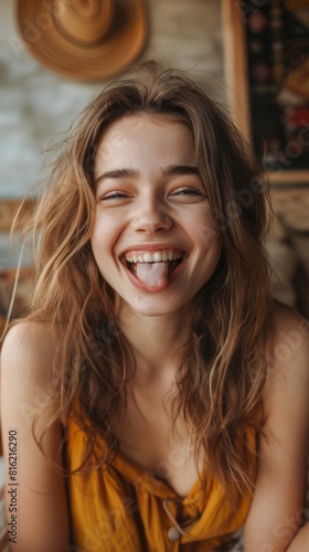 girl, laughing, sitting, bed, bedchamber, happy, joy, laughter, cheerful, young, female, woman, person, indoor, room, relaxing, cosy, comfortable, casual attire, lifestyle, enjoyment, fun, humor, amusing, giggling, expressing, emotion, facial, expression, content, carefree, carelessness, spontaneous, authentic, genuine, candid, happiness, positive, mood, blithe, youthful, elation, gleeful, gleeful, grin, chuckle