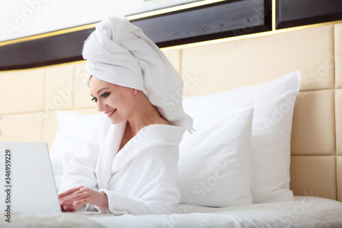 A young girl on the bed in a Bathrobe and a towel on her head is smiling and working on a laptop. The concept of distance learning or remote work. Home environment. Copy space.
