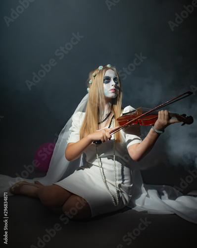 art, attractive, background, beautiful, beauty, black, blond, carnival, caucasian, costume, dress, elegance, entertainment, fashion, female, girl, hair, halloween, horror, make-up, model, music, musician, people, performance, performer, person, portrait, pretty, scarey, to sit, white, woman, young, youth