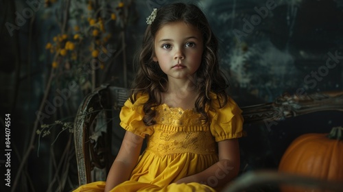 A young girl wearing a bright yellow dress sits on a chair, looking straight ahead