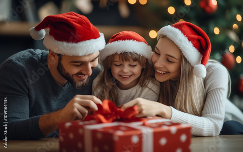a young girl with blonde, curly hair, wearing a Santa hat and holding a beautifully wrapped Christmas gift. Her joyful expression and the twinkling lights of a Christmas tree in the background create