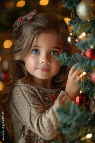 girl, children, young, christmas, tree, decorate, ornament, light, festive, little girl, holiday, season, winter, december, red, green, blond, hair, blue, eye, smile, happy, joy, cheerful, magic, sparkle, tradition, family, celebration, decoration, spirit, time, eve, day, holiday, merry