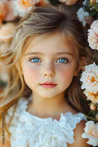 little, girl, blue, eye, flower, crown, head, flower, beauty, portrait, blond, hair, nature, photo, lighting, rose, pink, white, innocence, children, elegance, young, surrounded, closeup, long, looking, camera, serious, expression, face, wearing, dress, ruffle, shoulder, styled, loose, curl, background, blurred, garden, orange, mood, soft, dreamy