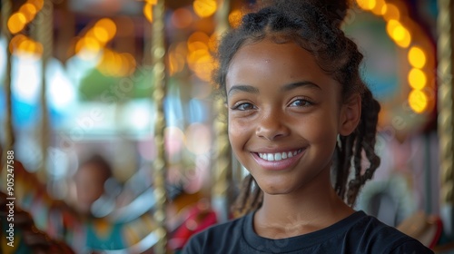 A young girl with braids smiles brightly while standing against a background of illuminated carousel lights, capturing a moment of joy and happiness at an amusement park.