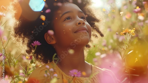 A young girl with curly hair smiling and looking up while surrounded by colorful flowers in a sunlit field.