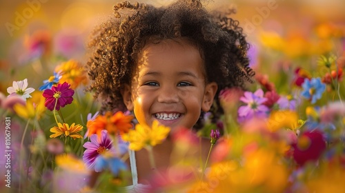 A young girl with flowing hair smiles brightly as she holds wildflowers in a field of golden autumn leaves