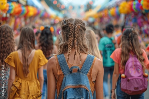 exploration, youth, adventure, carefree, excitement, freedom, innocence, modern, girl, fair, carnival, crowd, summer, denim, leisure, casual attire, activity, festival, enjoyment, people, amusement, walking, atmosphere, vibrant, youthful, social, fun, colourful, entertainment, backpack, lifestyle, gathering, cheerful, sunny day, energy, fairground, candid, amusement park