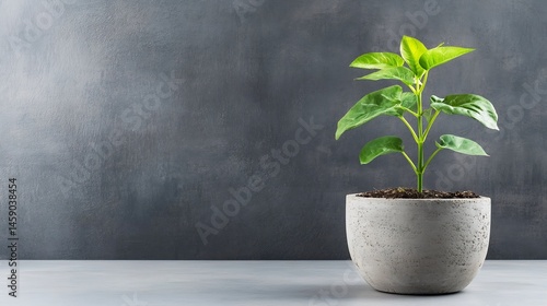A young green plant with vibrant leaves thrives in a light gray concrete pot, set against a textured dark gray wall. The scene evokes feelings of growth and serenity. : Generative AI