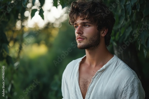 A young handsome man in white linen clothing in nature. A photo of a man with natural beauty in the wild, the aesthetics of high spirituality.