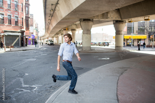 new york city, photogenic, crossing, commuting, commuter, city, brooklyn, background, copy space, urban, street, spring, outside, outdoors, 1, new york city, hispanic, latino, man, male, person, people, adult, adult, 20s, young adult, young adult, young person, grown-up