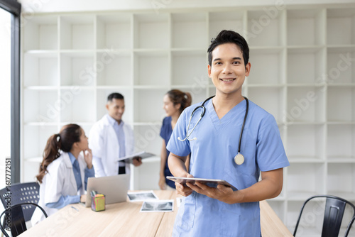 A young male doctor smiling looking at the camera in meeting room, Medical team reviewing data.