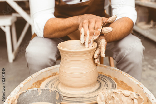 A young male potter works in his workshop on a potter's wheel and makes clay products. Close-up of hands