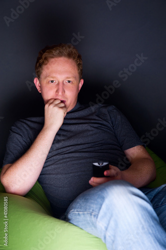 20s, adult, casual attire, caucasian, changing, channel, comfortable, concept, control, cute, home, human, indoor, interior, male, man, 1, only, people, person, room, shirt, sitting, spectator, technology, television, television, watching, young, apartment, background, blue, comfort, couch, face, holding, jean, leisure, lifestyle, living, look, modern, recreation, relaxing, remote, resting, t-shirt, wearing, serious