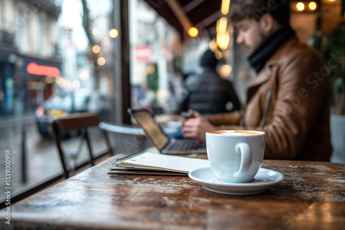 A young man, dressed in a brown leather jacket, enjoys coffee while working on his laptop in a cozy caf?.