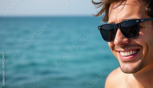 A young man enjoying a sunny day by the ocean wearing sunglasses and smiling with the sea in the background