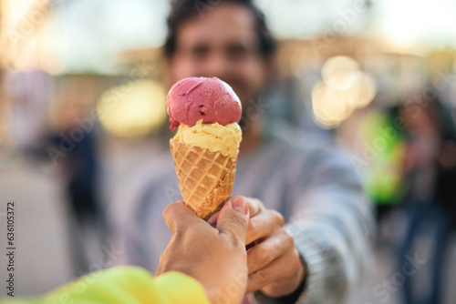 eating, face, hair, happy, ice cream, knitwear, male, phone, portrait, smile, sunset, sweater