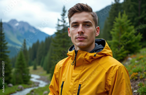 A young man in a yellow jacket standing outdoors in a mountainous forest landscape