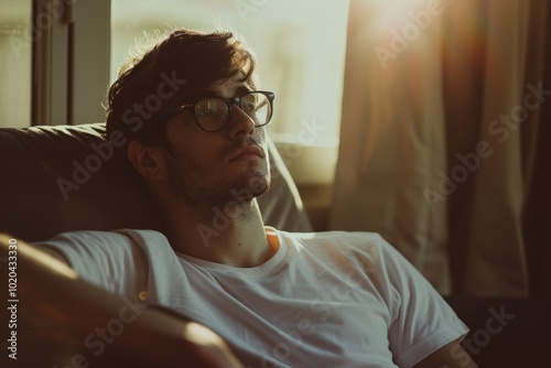 A young man in glasses sits in deep thought on a couch, bathed in warm sunlight streaming through a window.