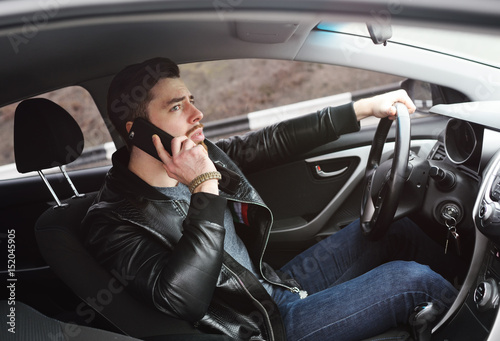 A young man is talking on the phone while driving a car. Emergency situations on the road.
