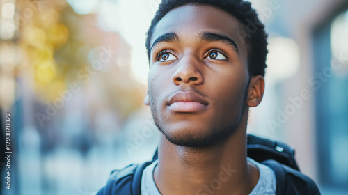 man, young, person, face, portrait, closeup, eye, looking up, thoughtful, urban, city, backpack, daylight, male, youth, student, teenage, expression, contemplation, sharpened, depth of field, blurred background, skin, coiffure