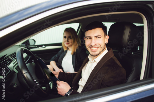 A young man rents a car. Employee of the dealer center shows documents in the car