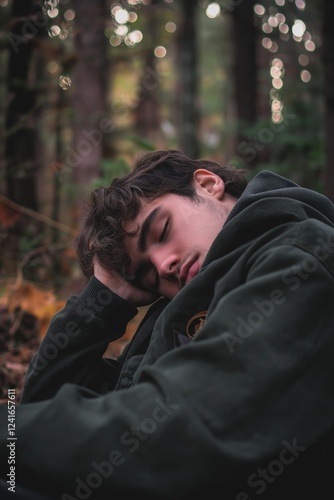 sleep, nature, peace, calm, forest, boy, youth, calmness, serenity, emotion, beauty, solitude, essence, harmony, outdoors, resting, natural, peacefulness, subconscious, freshness, greenery, earth, stillness, connection, wellness, wilderness, foliage, sunlight, comfort, quietude, relaxation, life, rejuvenation, organic, age, contemporary, casual attire, exploration, dreaming