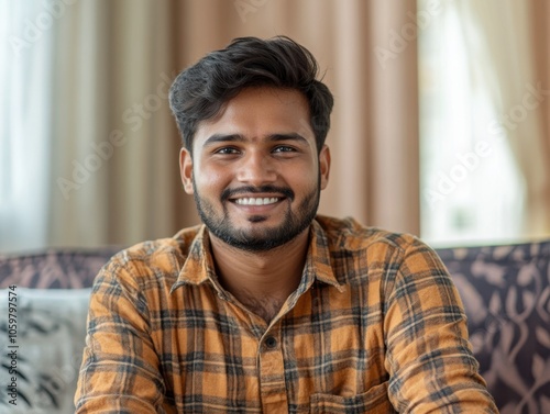 portrait, young, man, smile, casual attire, attire, plaid, shirt, beanie, indoor, setting, decorative, curtain