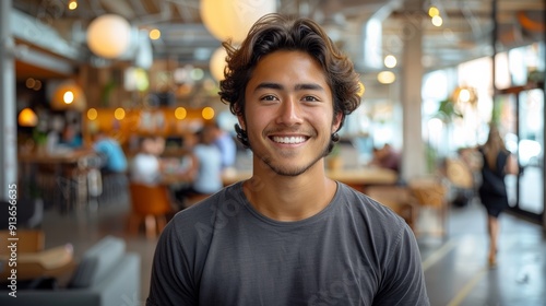 A Young Man Smiling Happily in a Vibrant Café With Modern Decor During Daytime