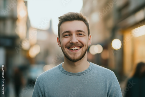 A young man smiling warmly at the camera while standing on a bustling city street, capturing the essence of urban life and joy.