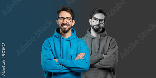 A young man stands confidently with his arms crossed. He wears a bright blue hoodie, embodying a positive vibe. The contrasting dark background highlights his cheerful expression and relaxed demeanor